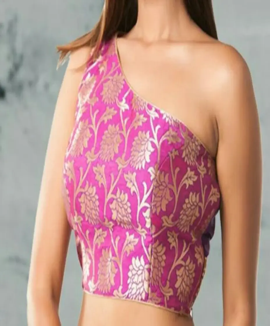 This blouse is perfect for weddings, receptions, or festive occasions where a blend of traditional textiles and contemporary styling is desired.