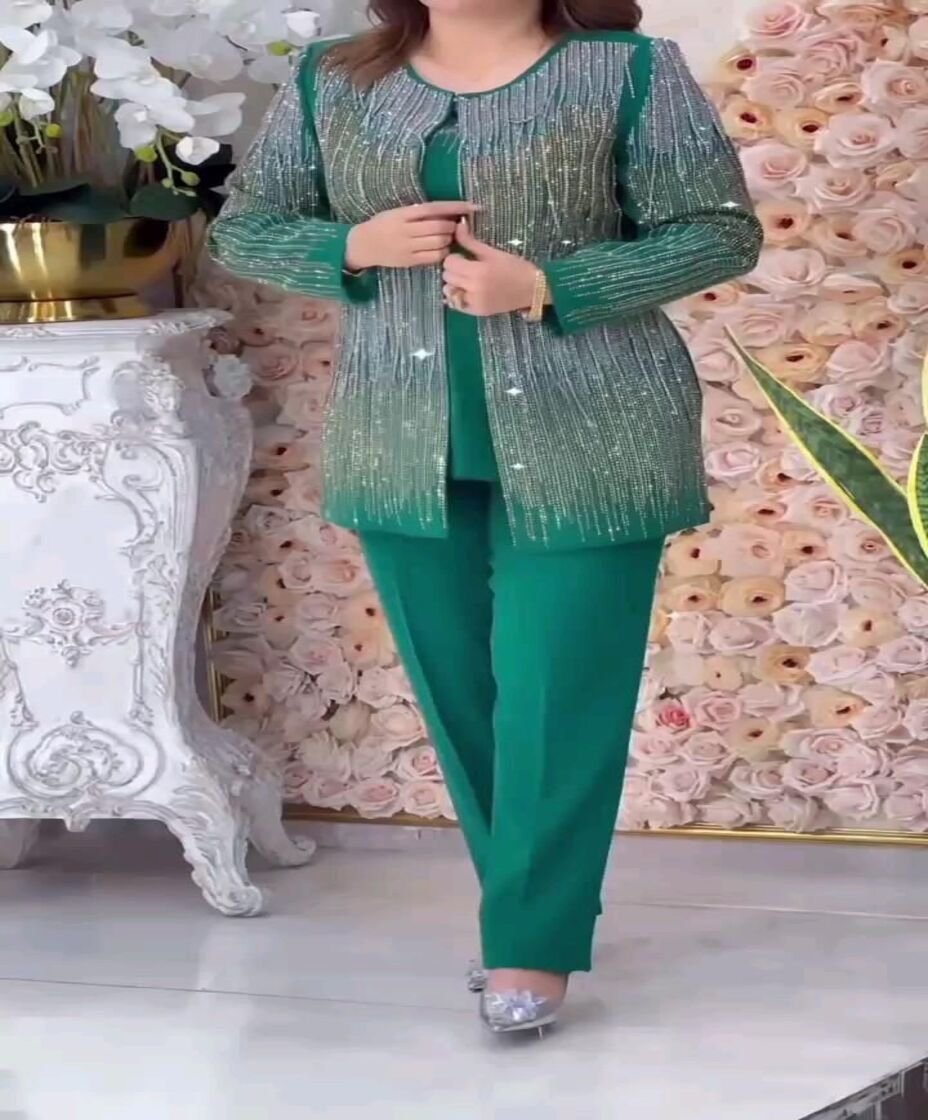 This is an elegant three-piece pant suit ensemble featuring a solid green base layer and heavily embellished jacket, suitable for special occasions.